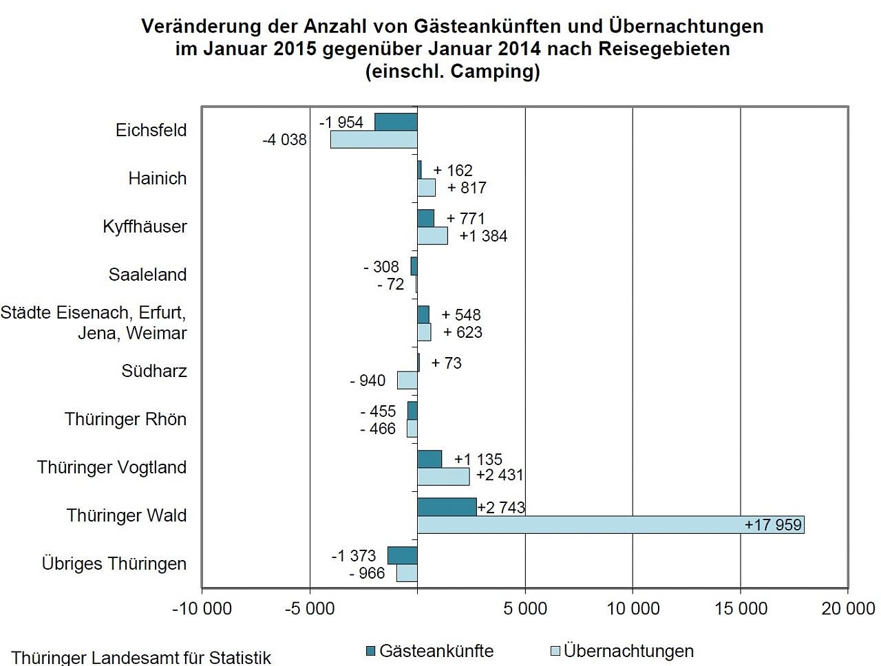 Der Thüringer Tourismus startete nach dem Rekordjahr 2014 mit einem Gäste- und Übernachtungsplus in das Jahr 2015. Die Thüringer Beherbergungsstätten mit zehn und mehr Gästebetten und Campingplätze mit zehn und mehr Stellplätzen empfingen im Monat Januar 195.000 Gäste und verbuchten 535.000 Übernachtungen.
