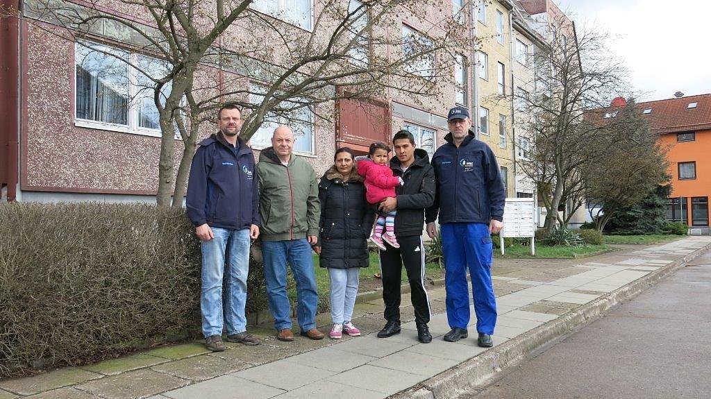 Von links: Manfred Mock (Sozialarbeiter WBG), Ernst Scholze (Schrankenlos), Familie Balja aus Bosnien, Ralf Elster (Wohnungswart WBG)Als Partner des Landkreises Nordhausen hat die WBG aktuell 37 Wohnungen für diese Menschen in Not zur Verfügung gestellt - zehn weitere Wohnungen werden bis zum 15. April vorbereitet.