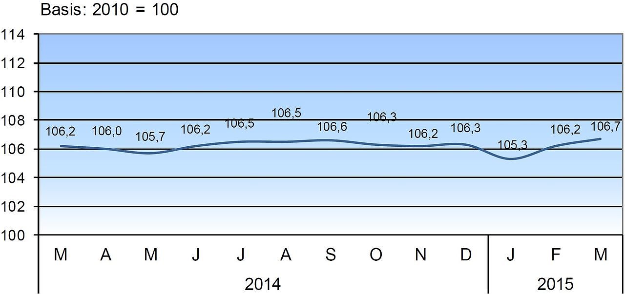 Nach Mitteilung des Thüringer Landesamtes für Statistik stieg der Verbraucherpreisindex im Monat März gegenüber dem Vormonat Februar um 0,5 Prozent und erreichte einen Indexstand von 106,7 Prozent (Basis 2010=100). Die Jahresteuerungsrate stieg von 0,2 Prozent im Monat Februar auf 0,5 Prozent im Monat März.