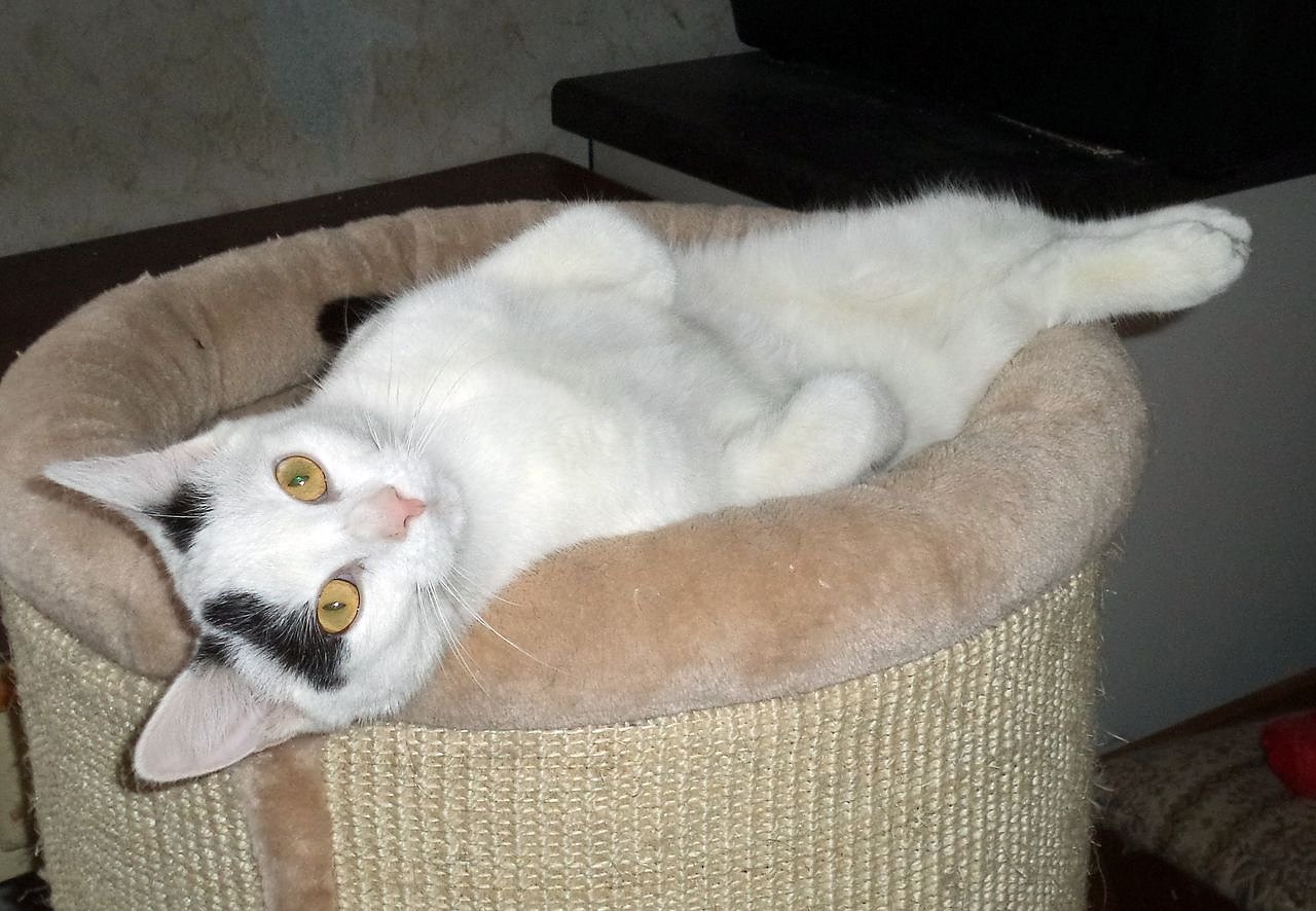 Autor: redElla wurde im August vorigen Jahres geboren. Sie ist eine weiße Katzendame mit drei schwarzen Punkten am Kopf und einem schwarzem Schwanz.