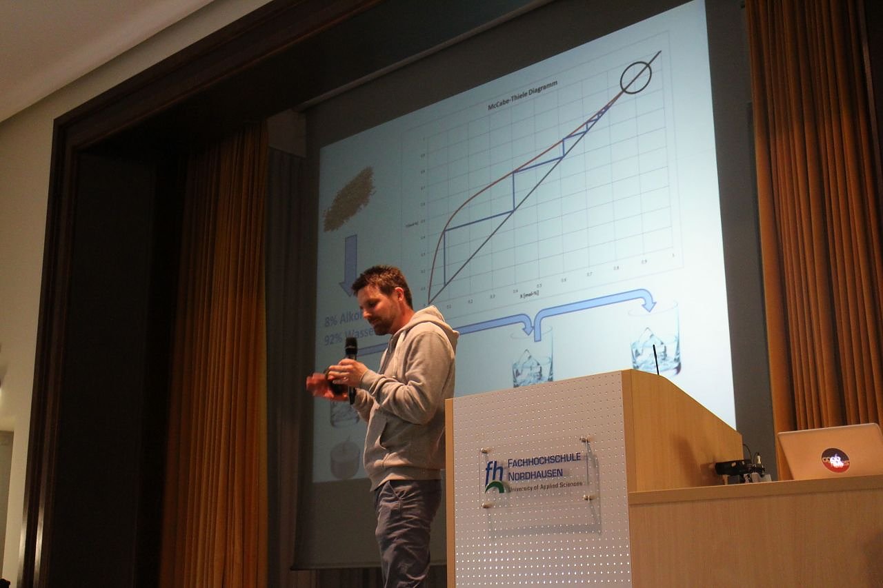 Er eröffnet den Abend mit dem Thema: Mikro-Destillation. Sprich mit Schnaps. Drei mal dürfen sie raten wie das beim Nordhäuser Publikum ankam. Damit aus körnigem Getreide hochprozentiger Klarer wird bedient man sich eines thermischen Trennverfahrens, erklärt Derck. Durch einfaches erhitzen kann aus aufgeweichtem Ausgangsmaterial, sagen wir mal Korn, ein Gemisch mit