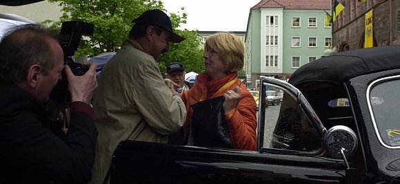 Heute saß die Oberbürgermeisterin mit ihrem Chauffeur Dr. Erhard Oehm lieber unterm Verdeck. Am Nordhäuser Rathaus stieg Barbara Rinke unter den Augen neugieriger Oldtimerfans aus. Ihr Sondershäuser Amtskollege Joachim Kreyer nahm auf dem Beifahrersitz Platz.