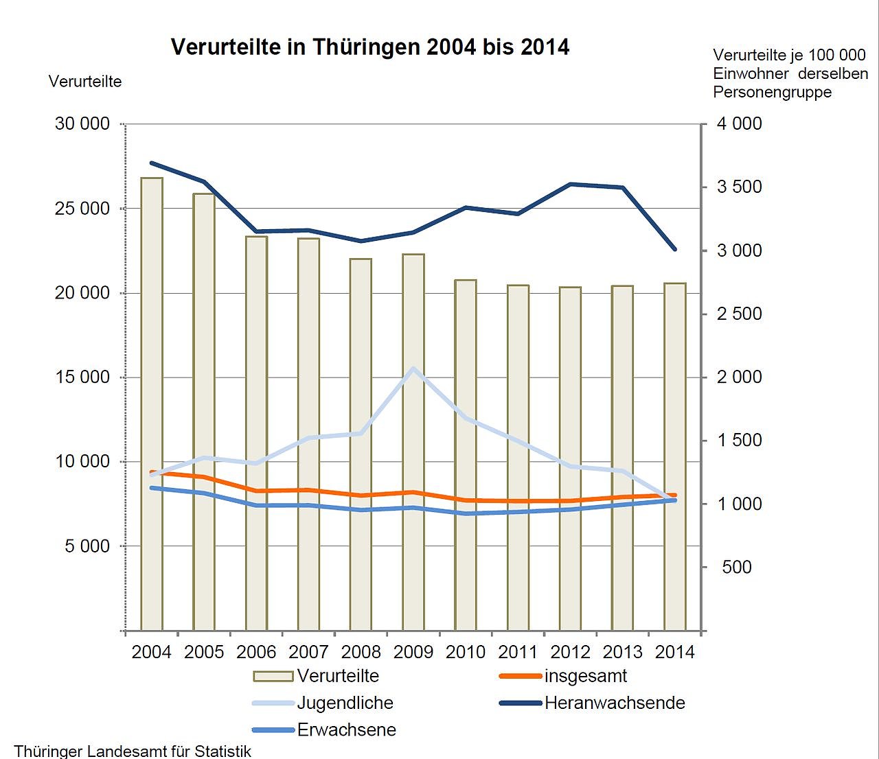 Jedoch sind die Verurteiltenziffern gegenüber 2013 und auch den Jahren zuvor stark zurückgegangen. Die Verurteiltenziffer der Heranwachsenden sank gegenüber dem Jahr 2013 um 14 Prozent, die der Jugendlichen um 19 Prozent. Erstmals seit 1997 wurden, gemessen an der jewei-ligen Altersgruppe in der Bevölkerung, weniger Jugendliche (1 020 Verurteilte je 100 000 der jugendlichen Bevölkerung) verurteilt als Erwachsene (1 030 Verurteilte je 100 000 der erwachsenen Bevölkerung).