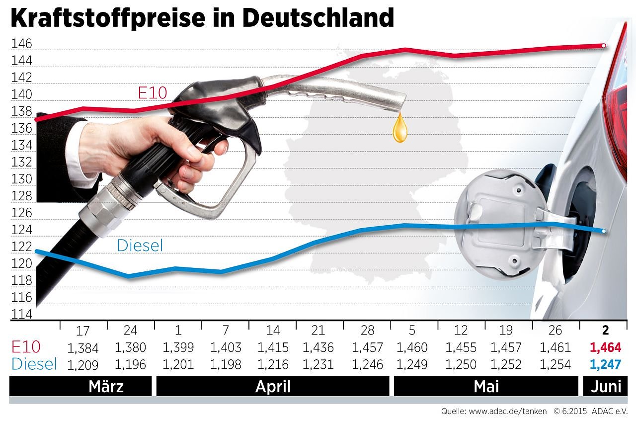 Der Preis für einen Liter Super E10 ist binnen Wochenfrist um 0,3 Cent auf 1,464 Euro gestiegen. Etwas günstiger ist dagegen Diesel: Ein Liter kostet derzeit im bundesweiten Mittel 1,247 – das sind 0,7 Cent weniger...