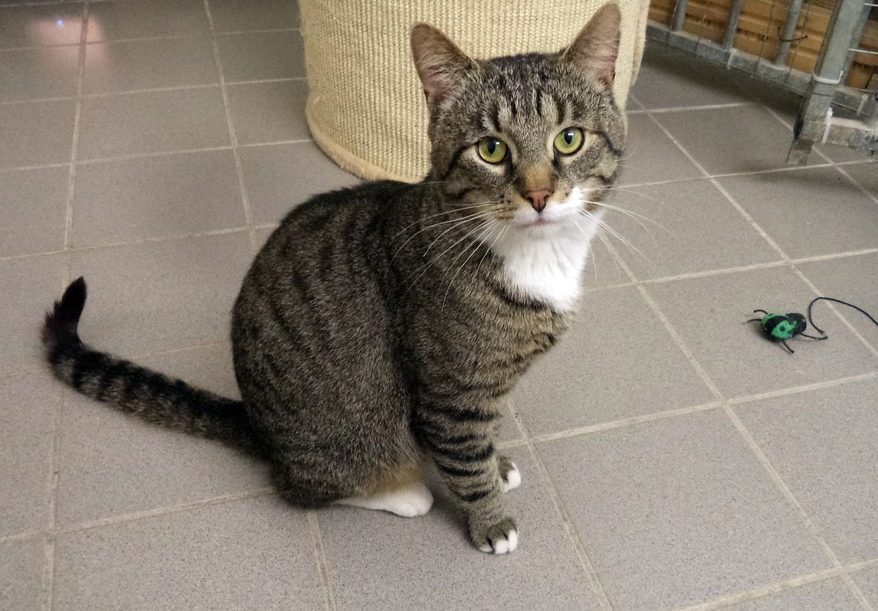 Odysseus steht heute für seine vielen Katzenmitbewohner als Tier der Woche. Er ist ein kastrierter getigerter Kater mit weißem Kinn und etwas 2 Jahre alt.