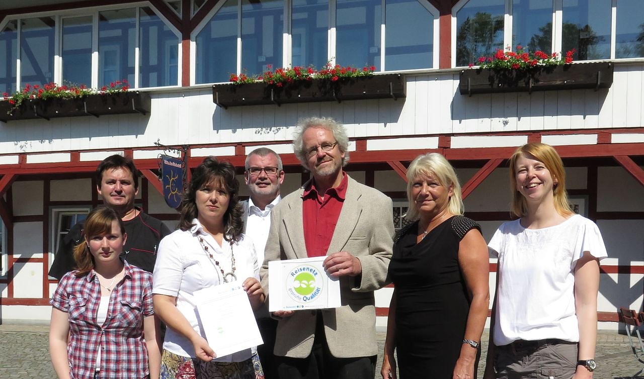 Von links: Christian Bornemann, Gerald Kühne (beides Mitarbeiter des Jugendgästehauses), Carmen Witzel, Stefan Nüßle, Knut Ewers, Hannelore Haase und Jessica Piper vom Tourismusverband Südharz KyffhäuserKnut Ewers, der Vorsitzende des Qualitätsausschusses des Reisenetzes übergab das Zertifikat am Vormittag an die Chefin der Rothleimmühle, Carmen Witzel.