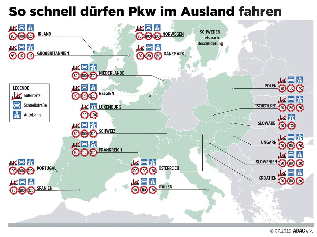 Wer mit dem Auto ins Ausland fährt, sollte die jeweiligen Geschwindigkeits-begrenzungen kennen. Denn schon bei geringen Überschreitungen drohen hohe Bußgelder. Der ADAC hat die Tempolimits in wichtigen Autoreiseländern zusammengestellt...