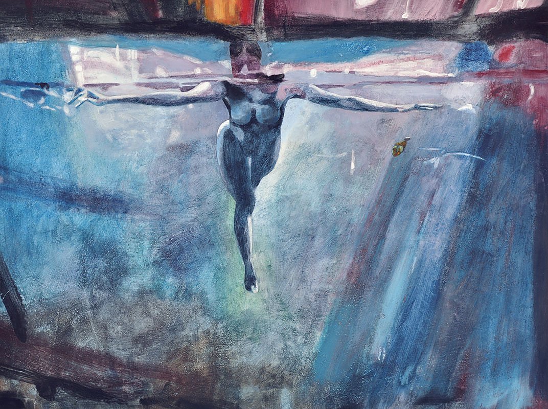 Erotik kommt dabei kräftig ins Spiel, aber nie vordergründig voyeuristisch, sondern eher so, dass ihre Vielschichtigkeit deutlich wird. Bei einem der neuesten Bilder, Traumwassertanz (2015), ist Sinnenfreude eher ein Nebenthema. Die Bewegung in zwei Elementen, in Luft und Wasser, signalisiert eine Phase des Übergangs, ebenso wie die zwischen Tag und Traum.