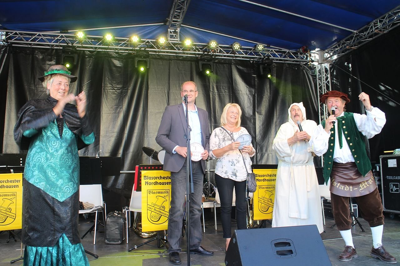 Hannechen Vogelstange, der Altstadt-Manne und der Riese gaben ähnlich ihren Kollegen von diesem anderem, großem Stadtfest kleine Geschichten und Zoten zum aktuellen Geschehen zum Besten. Am Anfang standen Vogelstange und Altstadtmanne, ähnlich ihre Kollegen vor wenigen Wochen, erst einmal allein auf der Bühne, bevor schließlich der Riese hinzustieß um das Trio komplett zu machen. Der war diesmal als Barfüßer Mönch verkleidet, und hatte das (leere) Stadtsäckel gefunden. In dem versteckte sich dann doch noch ein Groschen, der schließlich an die Beigeordnete Hannelore Haase und Landrat Matthias Jendricke übergeben wurde, damit sich beim Haushalt in Stadt und Kreis endlich was bewegt. Das ganze wurde natürlich in bestem Nordhisser Platt vorgetragen, wie bei den eben schon erwähnten Kollegen.