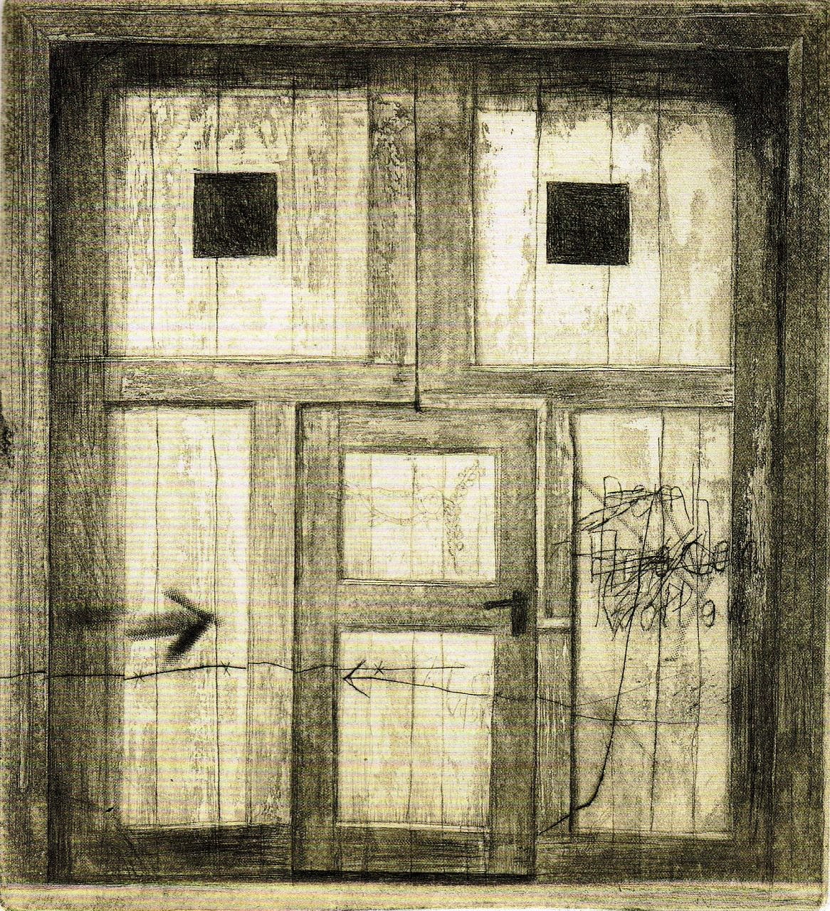 In den unteren Feldern des Tores, der Tür links, schwarz STACHELDRAHT die Grenze, die Mauer, das Trennende, das UNÜBERWINDLICHE?? In der Mitte unten: Bricht der Draht ab, hat er seine Stacheln verloren, ist er mutiert zu einem in der Entstehung befindlichen Seil, an das man sich halten kann, das vielleicht in ferner Zukunft verbindet? Und in der Mitte oben: ein Muster wie vom Borkenkäfer geschaffen, eben typisch alte Tür, die auch etwas hängt, deren Scharniere über die Zeit nicht mehr parallel und fest schließen, sich drehen. Aber was für ein Muster?