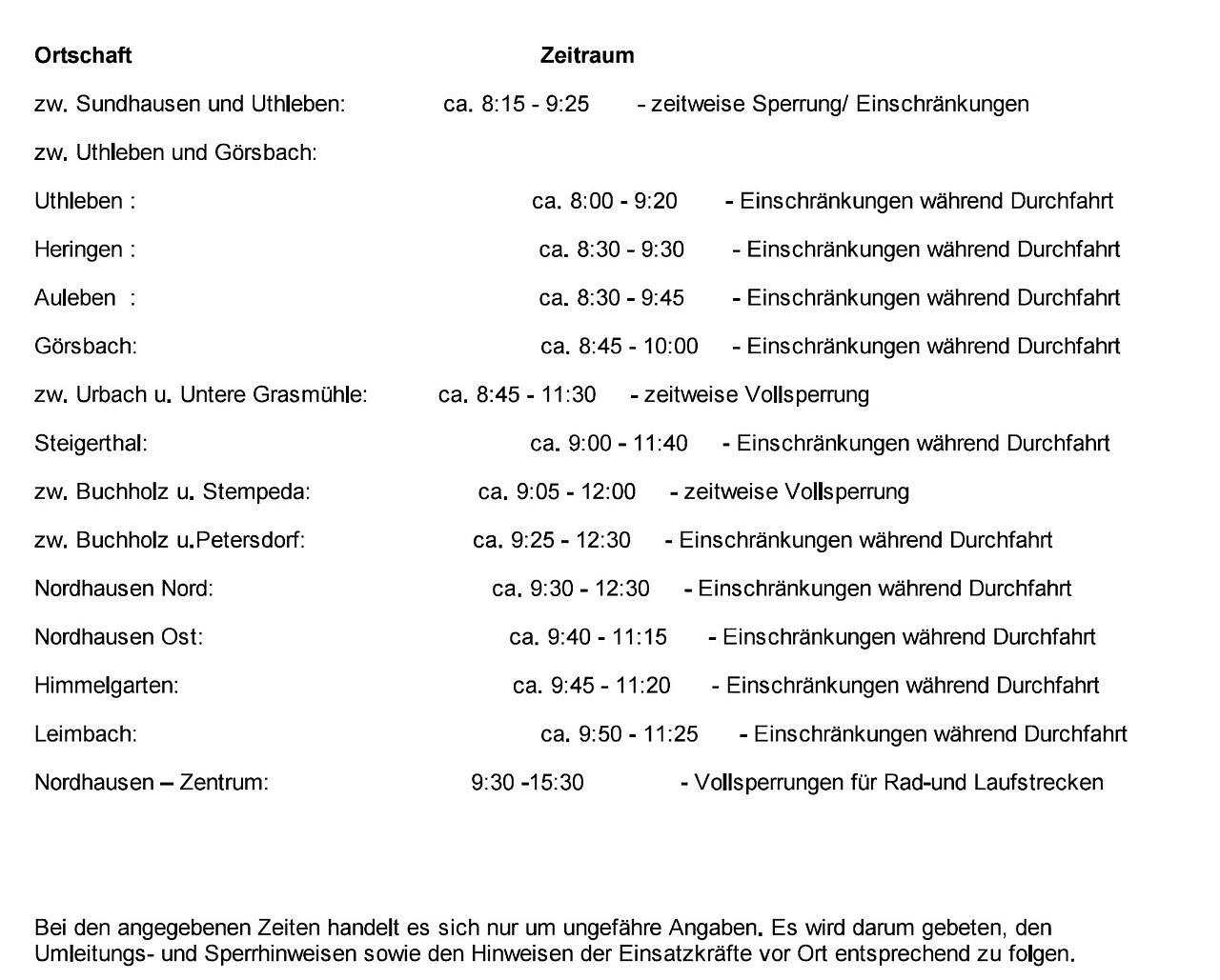Am Sonntag, 16. August sind zwischen 7.30 und 17 Uhr für die Radsportstrecke folgende Streckenabschnitte innerhalb des Landkreises und der Ortsteile Nordhausen betroffen.