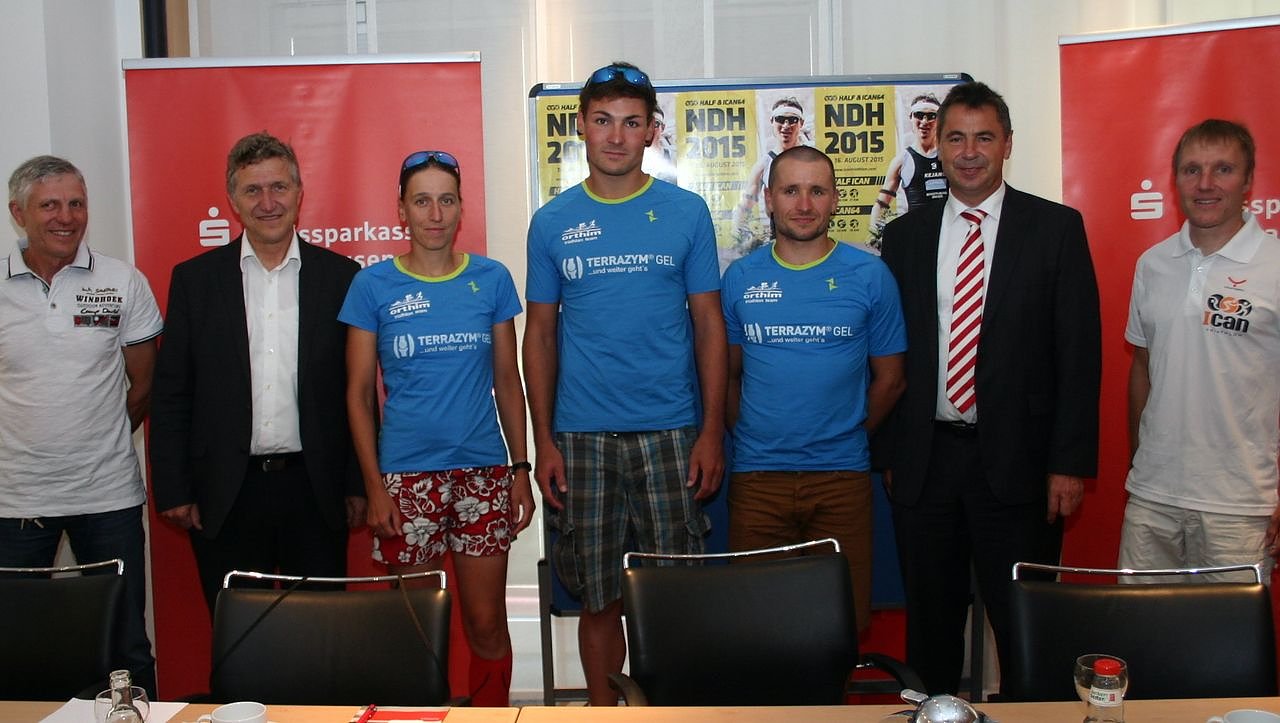 ICAN-Renndirektor Dr. Ulrich Konschak vom veranstaltenden Nordhäuser Tri-Team, Wolfgang Asche, Vorstandsvorsitzender der Kreissparkasse, die wie in all den Jahren zuvor wieder Hauptsponsor der Veranstaltung ist, sowie Nordhausens Oberbürgermeister Dr. Klaus Zeh, hatten für heute Nachmittag zum Pressetermin geladen. Mit ihnen standen mit Katja Konschak und Markus Liebelt die Sieger vom Vorjahr Rede und Antwort, dazu Peter Seidel, der 2014 Dritter war.
