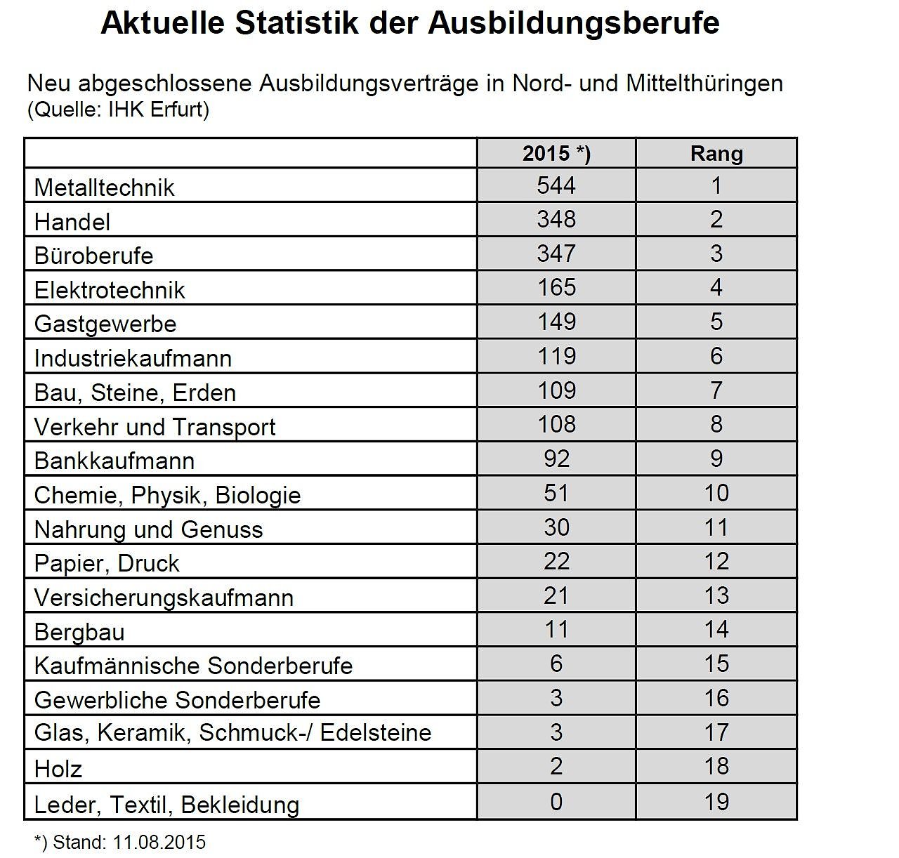 Die aktuelle Statistik zeigt deutlich, dass sich die Auszubildenden bei ihrer Berufswahl an wirtschaftlich starken Industriezweigen mit Wachstumspotential orientieren, fasst der IHK-Chef zusammen. So hätte sich die Metallindustrie bereits 2014 vom ehemals dritten auf den zweiten Platz vorgeschoben und rangiere nun sogar an der Spitze der ausbildungsstärksten Branchen. Der bisherige Primus Handel rutschte auf Platz 2 ab, die Hotel- und Gaststättenberufe vom ehemals 2. auf den nun 5. Rang.