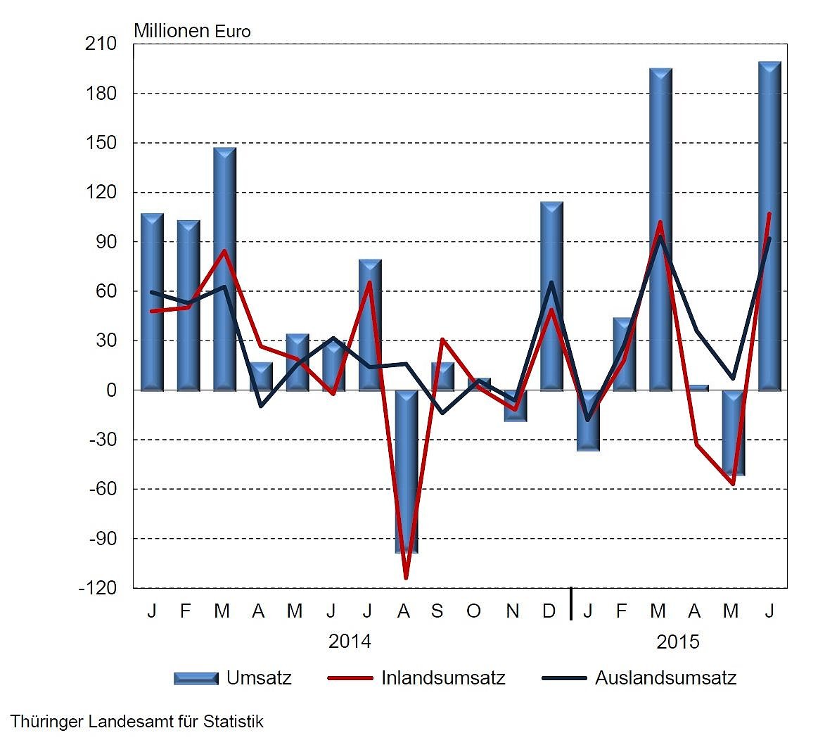 Die Umsätze im Inland stiegen um 1,2 Prozent auf 9,7 Milliarden Euro und die Exporte sogar um 5,0 Prozent gegenüber dem ersten Halbjahr des Vorjahres. Die Exportquote lag mit 33,8 Prozent um 0,8 Prozentpunkte höher als ein Jahr zuvor. Im ersten Halbjahr 2015 waren in den Thüringer Industriebetrieben durchschnittlich 140.000 Personen beschäftigt, 0,7 Prozent mehr als im vergleichbaren Vorjahreszeitraum, obwohl die Zahl der Betriebe mit 50 und mehr Beschäftigten um 14 auf 845 Betriebe gesunken ist.