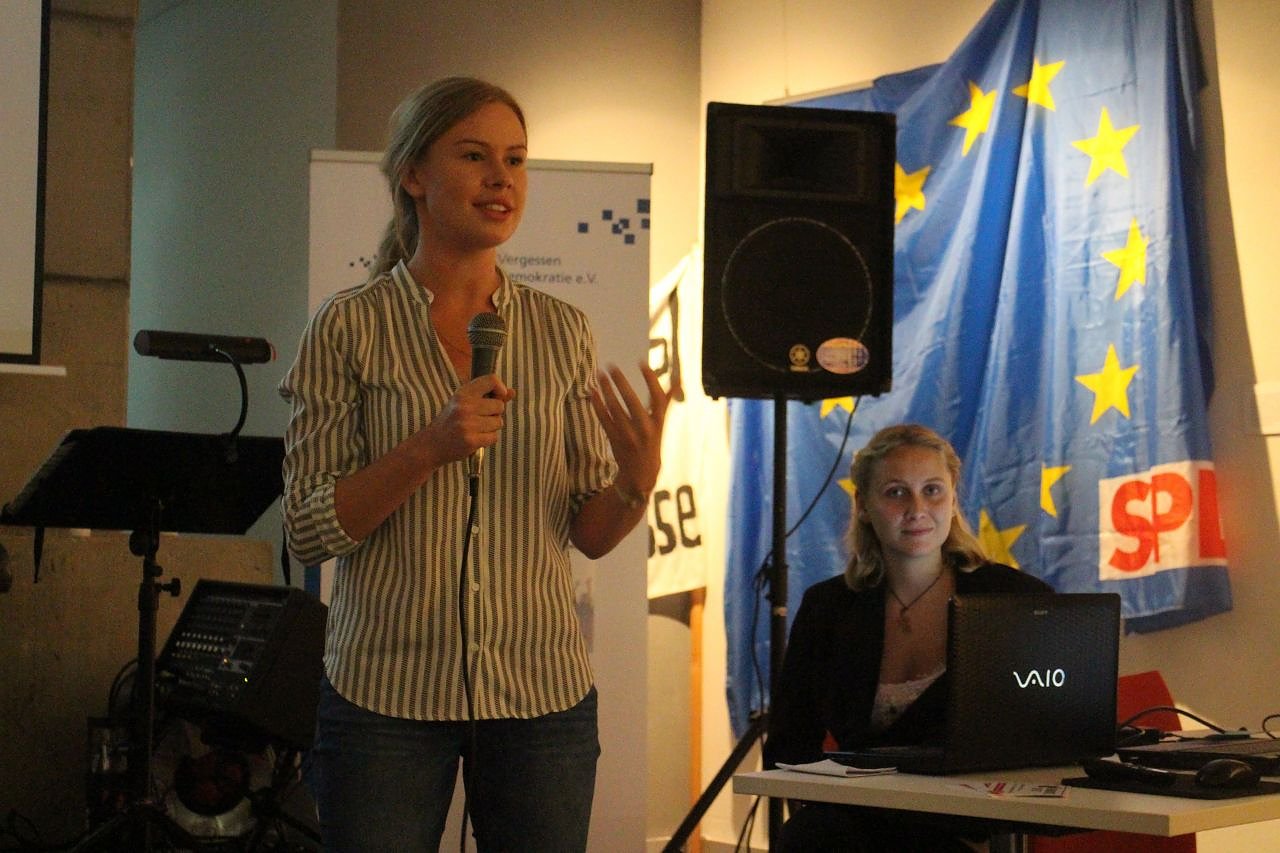 Für die "Fahnen der Erinnerung" erhielt die Jugend für Dora dieses Jahr den Thüringer Demokratiepreis. Insgesamt 39 Außenlager hatte das KZ Mittelbau-Dora, die meisten davon sind vergessen, liegen heute am Rand von Dörfern wie Harzungen. Nahe der kleinen Gemeinde, die im dritten Reich gerade einmal 300 Einwohner zählte, wurde ein Lager errichtet, in dem 4000 Häftlinge untergebracht waren. Mit ihren Fahnen und Bodenaufklebern gingen die jungen Menschen in diese Gemeinden, dorthin wo Menschen sind, und wollten an die Geschichte erinnern, die heute kaum noch sichtbar ist. Die Resonanz war sehr gut, berichten die Vereinsmitglieder zur Vorstellung, einige Gemeinden hätten Interesse signalisiert mit dem Verein zusammenzuarbeiten und aus dem temporären Projekt etwas bleibendes zu machen.