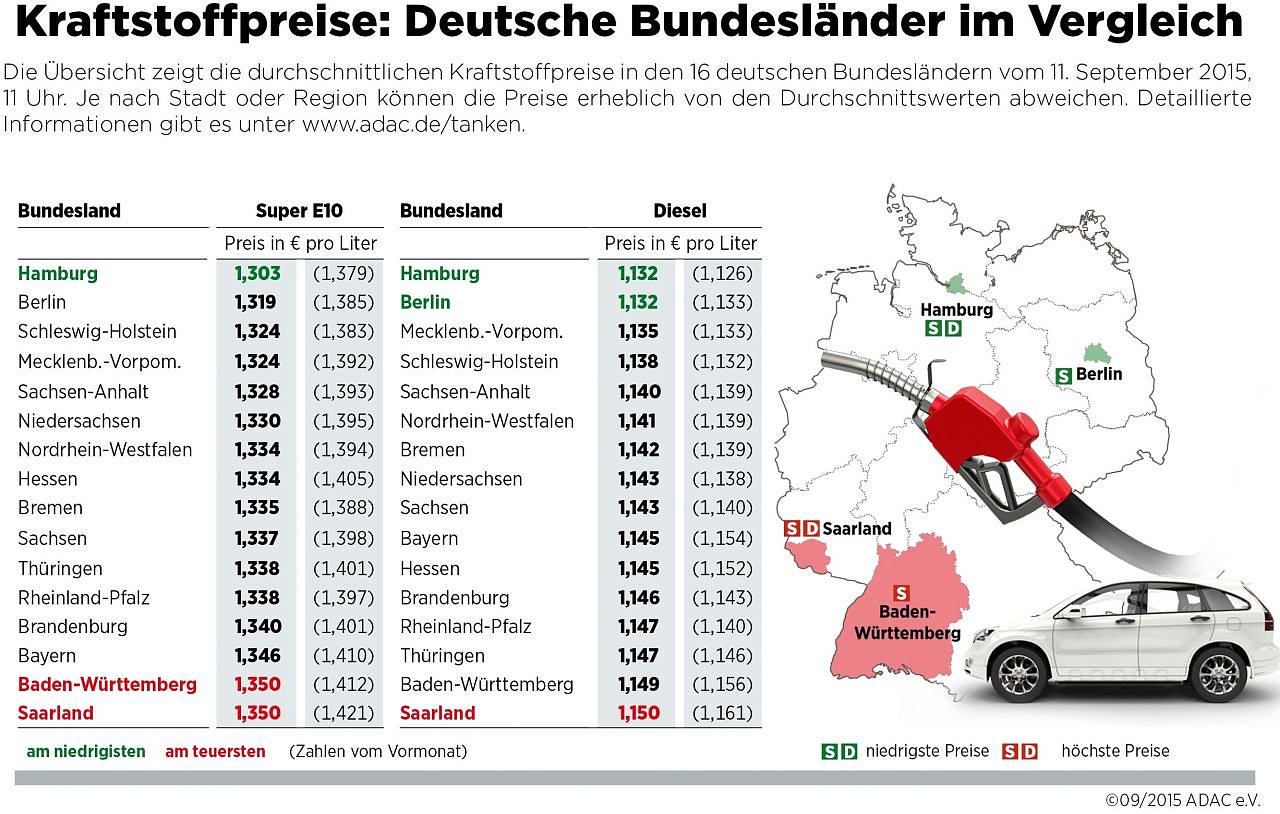 Die Preisdifferenz zwischen dem teuersten und günstigsten Bundesland liegt bei 4,7 Cent (Benzin) bzw. 1,8 Cent (Diesel). Die aktuelle ADAC-Auswertung bildet eine Momentaufnahme von heute (Freitag, 11. September 2015) 11 Uhr ab.