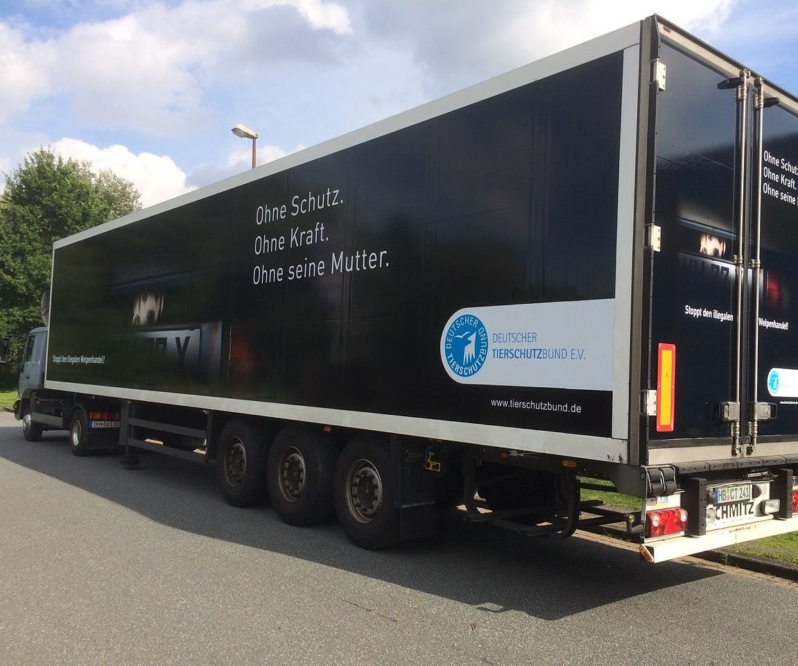 Auch auf der Autobahn bekommen die Tierschützer Unterstützung: Pünktlich zum Welttierschutztag startet ein LKW mit dem Welpen-Kampagnenmotiv und dem Aufruf Stoppt den illegalen Welpenhandel! seine Fahrt über Deutschlands Straßen. Ein zweiter LKW zeigt zudem das aktuelle Zirkusmotiv des Deutschen Tierschutzbundes. Beide Fahrzeuge hatte das Bremer Transportunternehmen CCT-Logistik dem Verband kostenfrei für die Bedruckung zur Verfügung gestellt.
