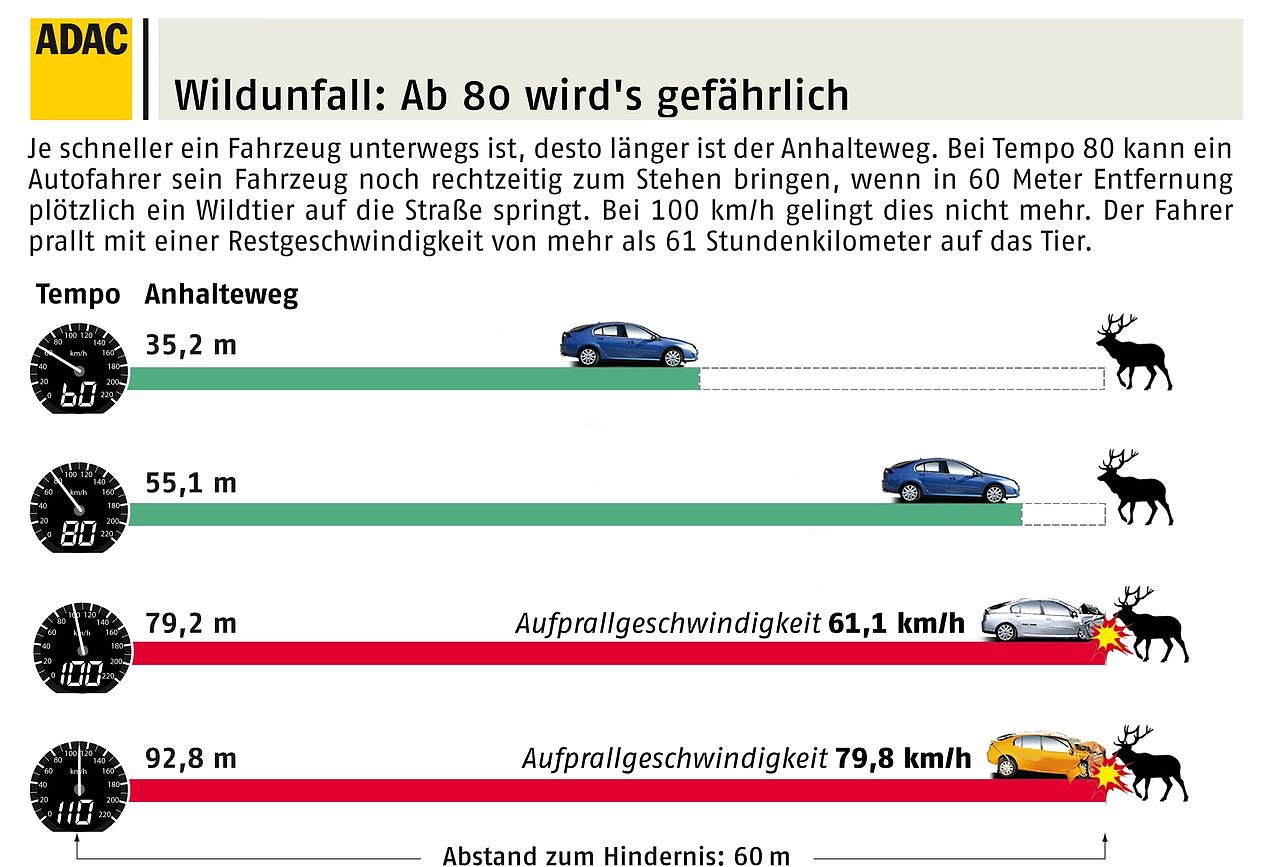 Kann ein Zusammenstoß nicht mehr verhindert werden, sollte der Fahrer das Lenkrad festhalten und eine Vollbremsung machen. Je schneller das Fahrzeug beim Unfall ist, desto größer die Wucht beim Aufprall des Tieres und damit auch das Verletzungsrisiko der Insassen. Ausweichmanöver sollte man auf jeden Fall vermeiden – sie enden nicht selten an einem Baum oder im Gegenverkehr.