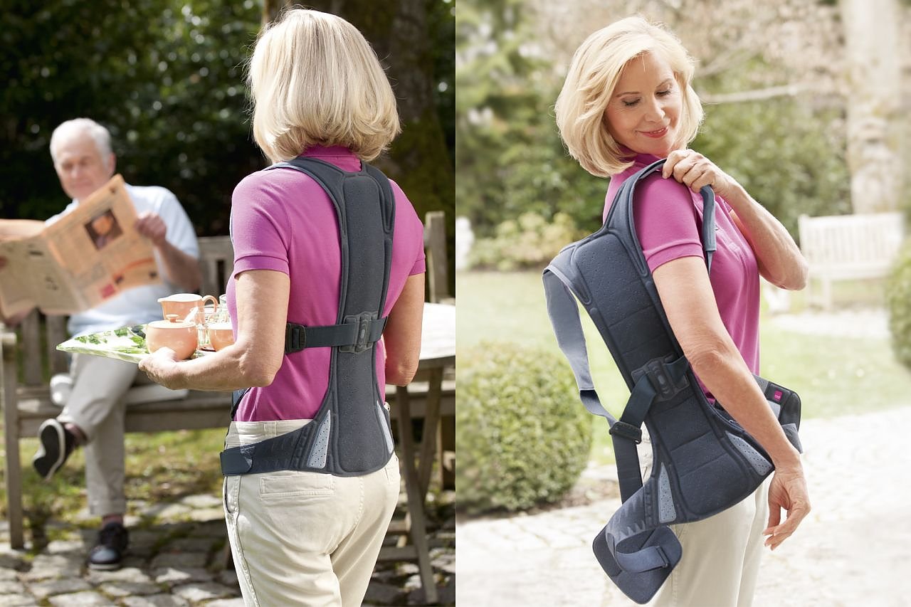 Um die Knochen zu festigen, die Haltung zu verbessern und Schmerzen zu lindern, kombiniert die leitliniengerechte Osteoporose-Therapie3 moderne Medikamente, Bewegungskonzepte und wirbelsäulenaufrichtende Rückenorthesen (wie Spinomed von medi). Der Arzt kann sie bei Notwendigkeit nach einem Wirbelbruch verordnen, der Orthopädietechniker passt sie individuell an.