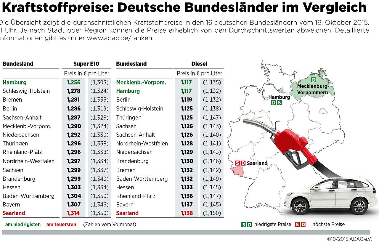 Ebenfalls teuer tanken die Autofahrer in Bayern. Ein Liter E 10 schlägt im Freistaat mit 1,307 Euro zu Buche, der Dieselpreis ist mit 1,137 Euro nur knapp niedriger als im Saarland. Benzin ist neben Hamburg vor allem in Schleswig-Holstein (1,278 Euro je Liter E10) und Bremen (1,281 Euro je Liter E10) günstig. Bei Diesel tanken die Autofahrer abgesehen von den beiden Spitzenreitern Mecklenburg-Vorpommern und Hamburg noch in Berlin (1,119 Euro je Liter Diesel.