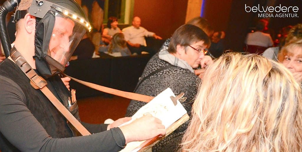 Die große Überraschung des Abends ließ dann auch nicht mehr lange auf sich warten. Ein beeindruckend aussehender Pyrozeichner verzaubert die Gäste während er innerhalb von 84 Sekunden mit einer einfachen handelsüblichen Wunderkerze das Porträt eines Menschen in ein einfaches, handelsübliches Blatt Papier zeichnete – eine tolle Erinnerung an diesen besonderen Abend.
