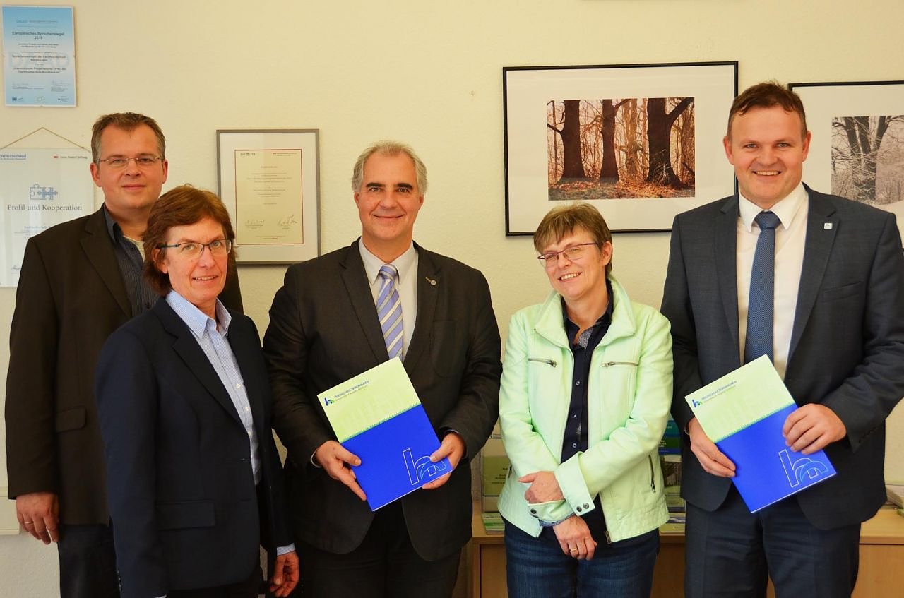 Von links: Dr. Rainer Hartmann, Anmagret Lohse und Jörg Leppin von der Elly-Heuss-Knapp- Schule sowie Prof. Dr. rer. nat. Uta Breuer und Prof. Dr. Jörg Wagner von der Hochschule Nordhausen