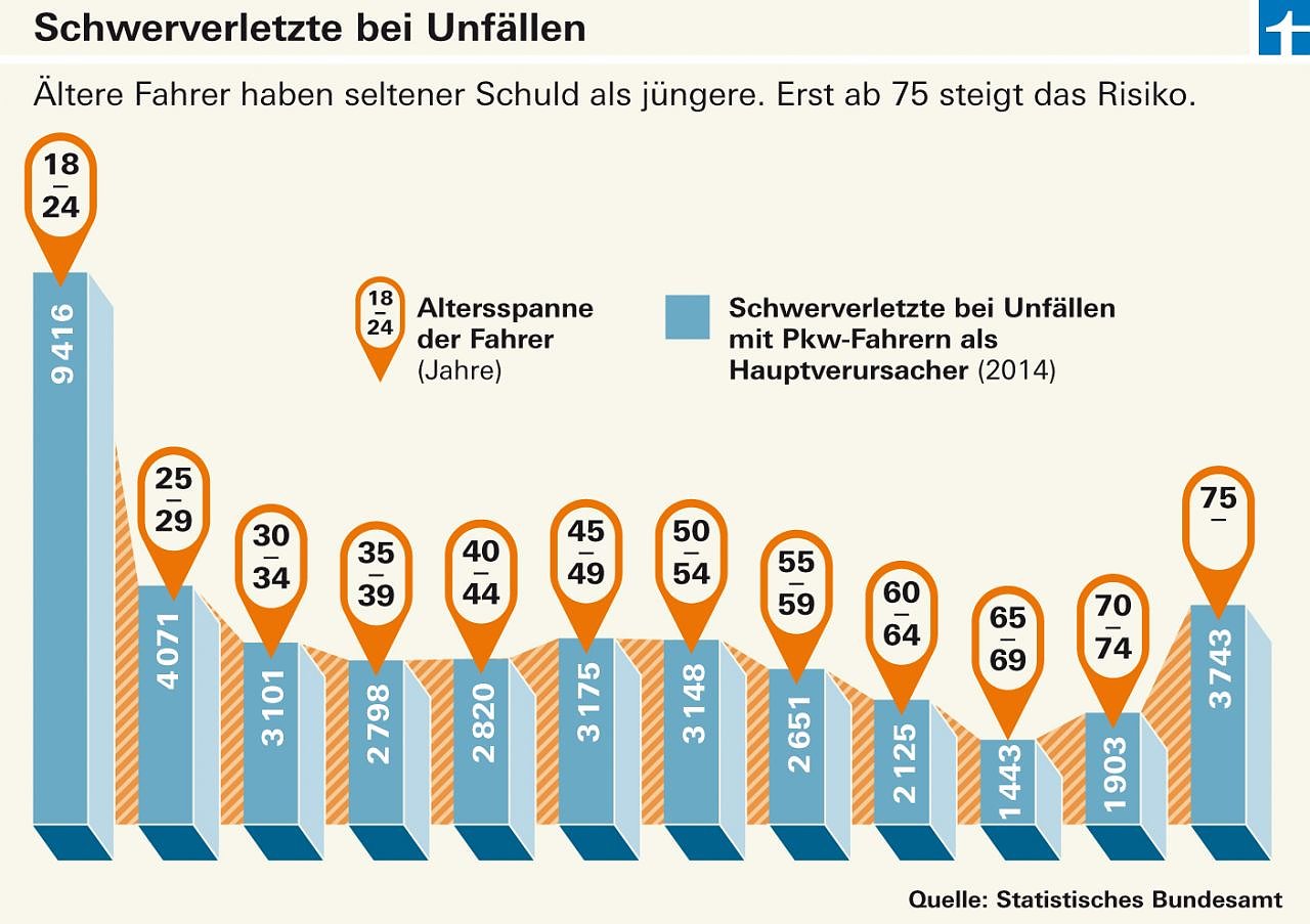 Auch wer ein Leben lang unfallfrei gefahren ist, muss im Alter für die Kfz-Versicherung happige Zuschläge zahlen. Wer über 75 Jahre alt ist, zahlt fast die Hälfte mehr als ein 55-Jähriger – für denselben Versicherungsschutz bei sonst gleichen Voraussetzungen...