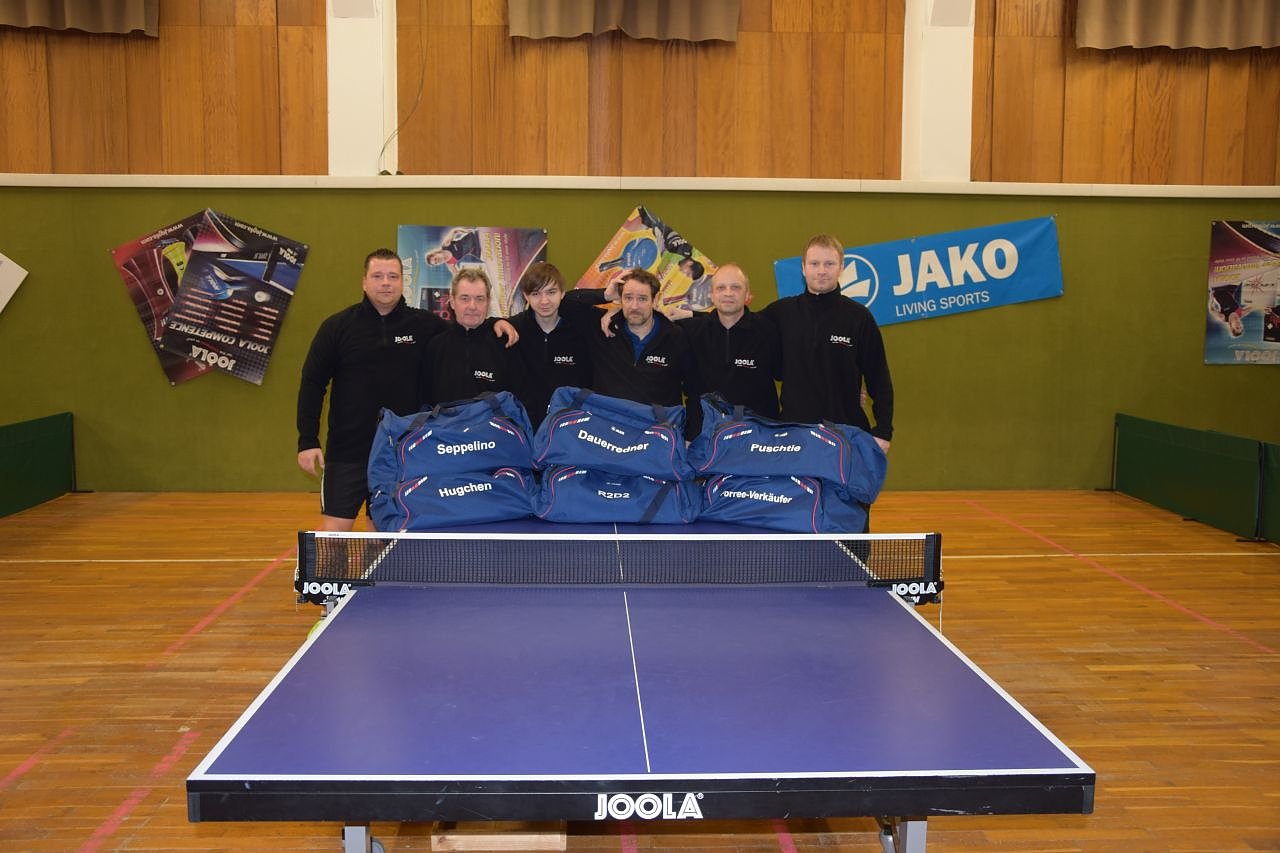 Die Spieler Tino Köhler, Udo Eidam, Sergej Zumbal, Jan Fehling, René Rethfeld und Markus Domnick (v. l. n. r.) freuen sich über die gesponserten Sporttaschen.