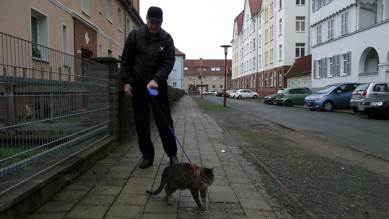 Je nach Witterung und Laune seines kleinen Freundes unternimmt Klaus Adam kleine oder größere Spaziergänge mit Kater Felix.