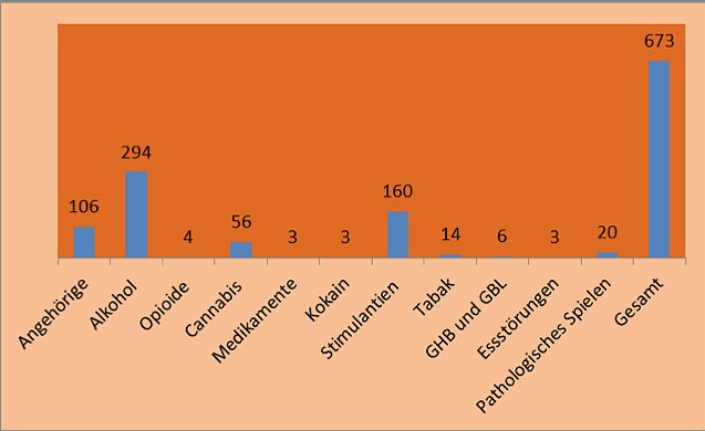 Wegen "pathologischem Spielen" befanden sich 20 Personen in Behandlung, 14 wegen Tabakabhängigkeit. Medikamentmissbrauch und Kokain spielten mit je drei Fällen eine untergeordnete Rolle. Hier sei die Dunkelziffer aber wohl um einiges höher, meinte Rzepus, für Deutschland gehe man in Sachen Medikamentenmissbrauch von 1 bis 1,2 Millionen Fällen aus, die Betroffenen würden aber nur selten Suchtberatungsstellen aufsuchen.