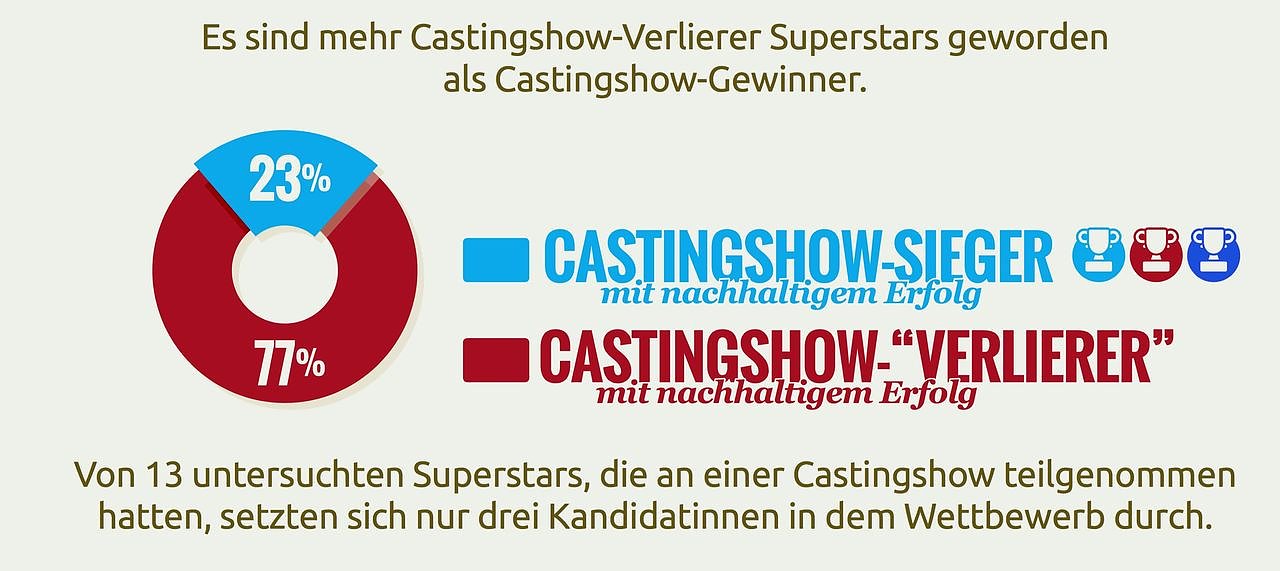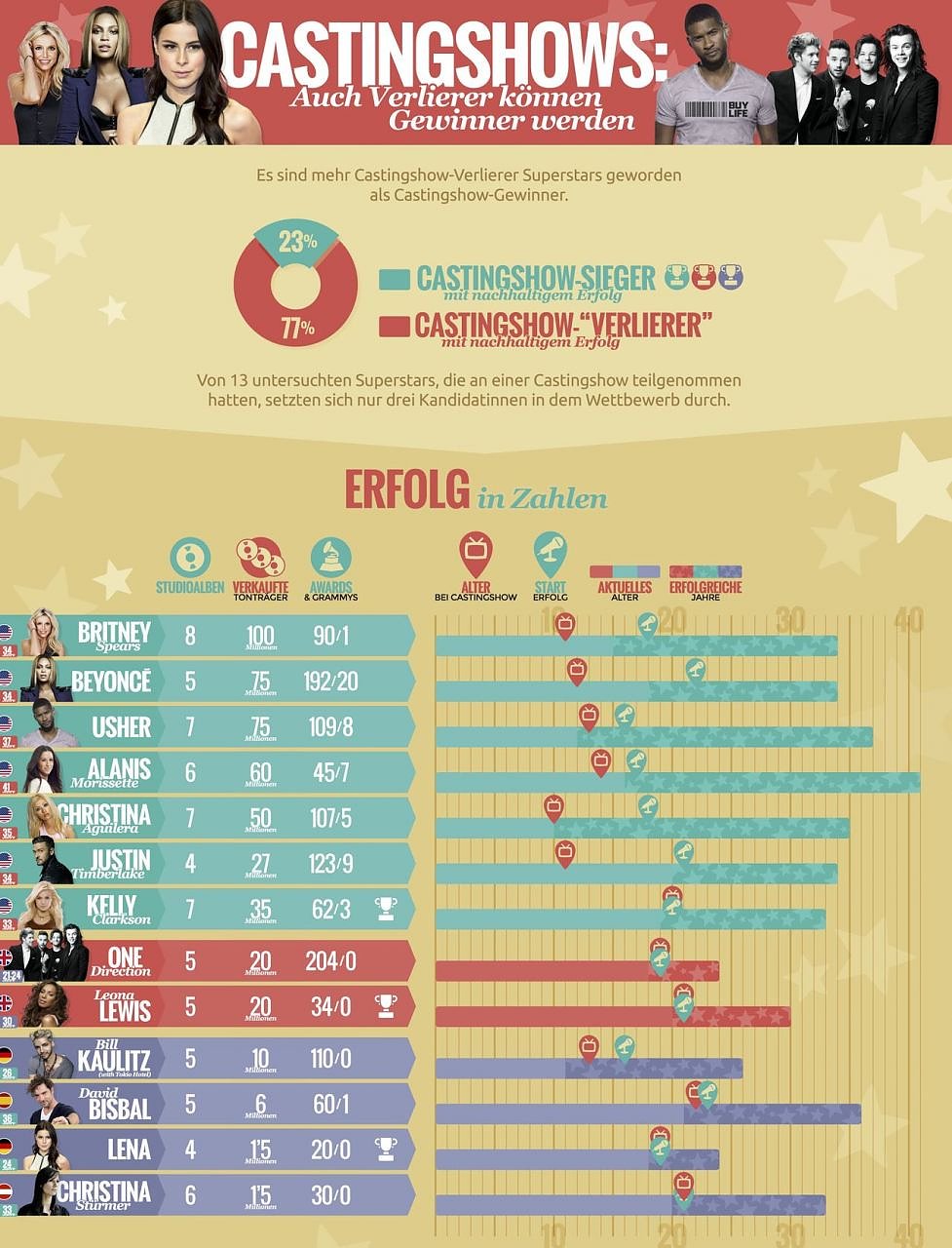 Kelly Clarkson 2002 bei American Idol”, Leona Lewis 2006 bei The X Factor" und Lena 2010 bei Unser Star für Oslo”. Einige Teilnehmer wurden dagegen trotz ihres Scheiterns bei einer Castingshow zu Superstars. Gute Beispiele hierfür sind Bestverdiener” wie Beyoncé, Justin Timberlake oder One Direction. Auch Stars mit besondes vielen verkauften Tonträgern – wie Britney Spears, Usher und Alanis Morissette – gehören dazu.