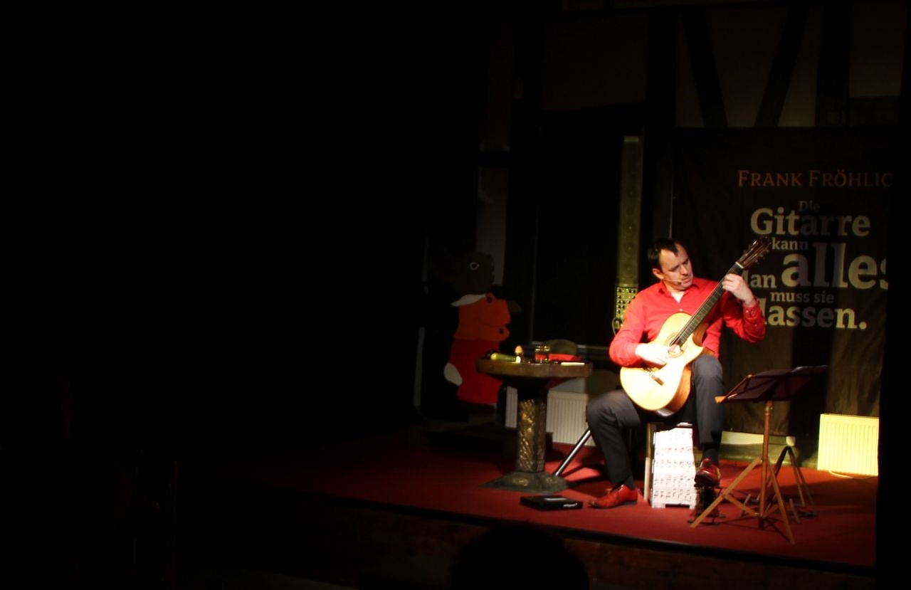 "Die Gitarre kann alles, man muss sie nur lassen" - das ist das Motto nach dem Frank Fröhlich Musik macht. Bewaffnet mit seiner Akustikgitarre und diversen Requisiten bespielte der "Hexenmeister der Gitarre" heute Abend den Tabakspeicher. Der Titel ist gut gewählt, Fröhlichs Spiel tänzelt zwischen langsam bedacht und fröhlich rennend ungezwungen hin und her.