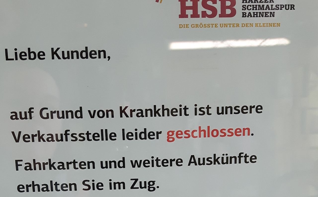 Wir bedauern diese kurzzeitige Schließung sehr. Dennoch können unsere Gäste aus dem Raum Nordhausen jederzeit im Zug Fahrkarten erwerben und dort auch weitere Auskünfte erhalten. Außerdem können Fahrausweise ebenfalls in unseren Agenturen in der Stadtinformation Nordhausen, Markt 1 sowie in Niedersachswerfen im Reisebüro Hahnemann am HSB-Bahnhof erworben werden.