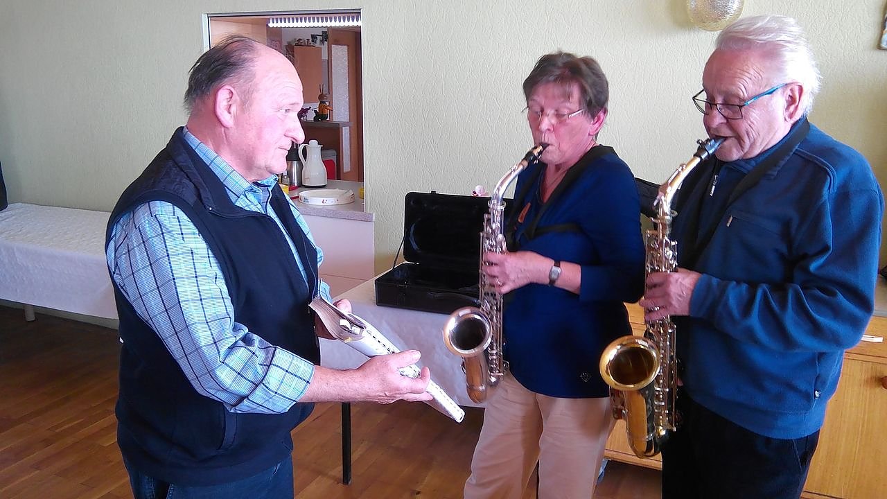 Eine kleine kulturelle Einlage boten mit Alt-Saxofon Karlheinz Prade mit Ehefrau Hannelies aus Ellrich, während Schwager bzw. Bruder Heinrich Kaempffe aus Mauderode ihnen das Notenbuch vor die Nase hielt (Bild).