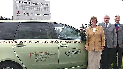 Die Autohaus-Peter-Gruppe ist für die Stadt Nordhausen zu einem verlässlichen Partner geworden. Neben dem Engagement zur Landesgartenschau unterstützt das Unternehmen nun auch den Kultursommer der Stadt. Geschäftsführer Helmut Peter und der Distrikt-Manager von Mitsubishi Heinrich Wolheim haben an Kulturamtsleiterin Dr. Cornelia Klose heute einen Mitsubishi Grandis übergeben. Das Kulturamt kann das Fahrzeug in diesem Jahr uneingeschränkt nutzen. So sollen unter anderem Künstler zu den verschiedenen Veranstaltungsorten gefahren werden. Darüber hinaus soll mit dem Grandis auch über die Region hinaus Werbung für den Kultursommer gemacht werden.