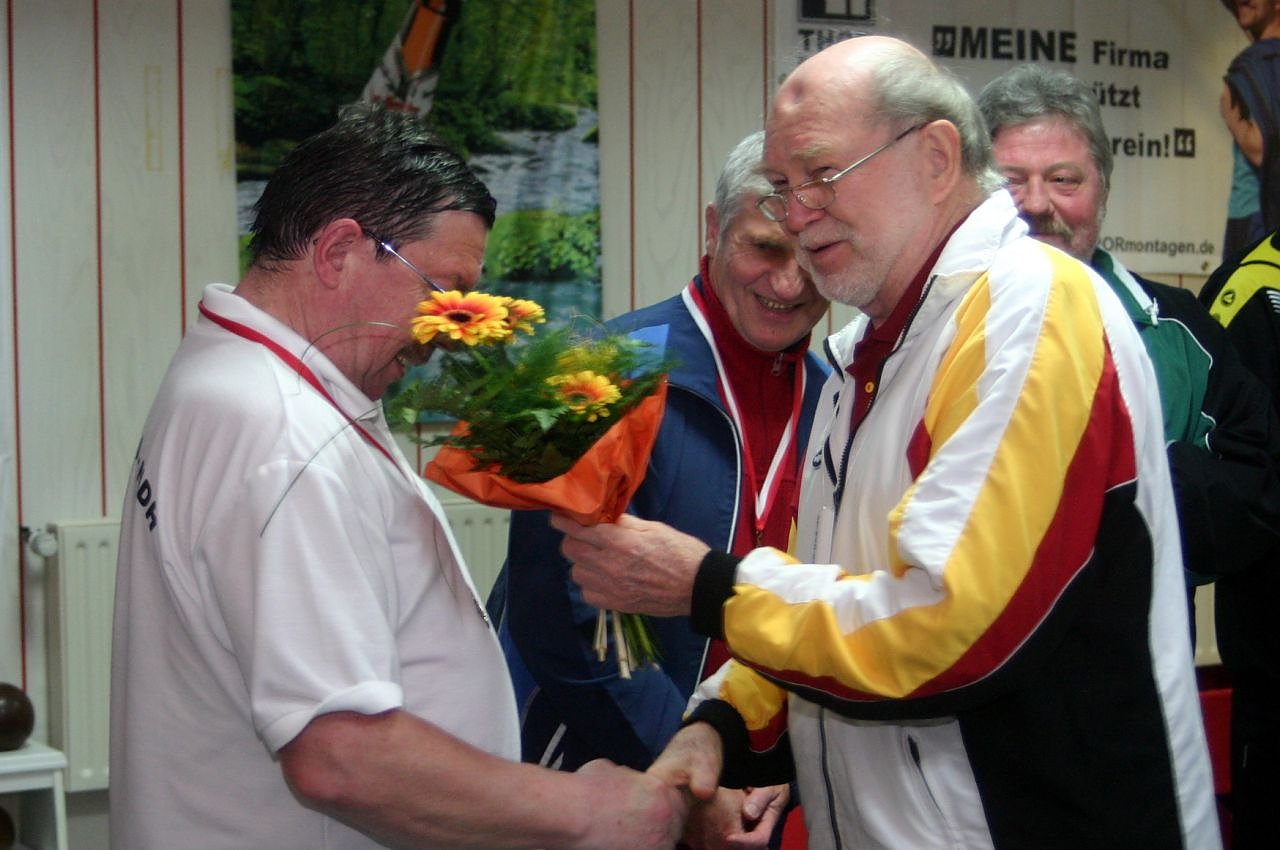 Im letzten Durchgang dann ein großartiger Kampf zwischen dem für Sömmerda startenden Gebeseer Günter Salzmann und Nordhausens Rainer Wille. Der Titelkampf war zwar schon entschieden, aber beide lieferten sich drei Bahnen lang einen begeisternden Kampf um den Tagessieg. Mit 148:144 und 138:136 gewann Rainer Wille die beiden ersten Bahnen, war dann knapp mit 122:123 unterlegen. Damit hatte Günter Salzmann sein Pulver aber wohl verschossen während sich der Nordhäuser noch einmal kräftig steigerte und Bahn Vier mit 144:118 deutlich für sich entschied. Damit pulverisierte er zugleich den in der ersten Runde von Wilfried Rösler aufgestellten neuen Bahnrekord noch einmal. Am verdienten Meistertitel für die Sömmerdaer, die drei Fünfhunderter in die Wertung brachten, aber gab es nichts mehr zu deuteln. Sie werden Thüringen nun bei der Deutschen Meisterschaft in Ludwigshafen vertreten.