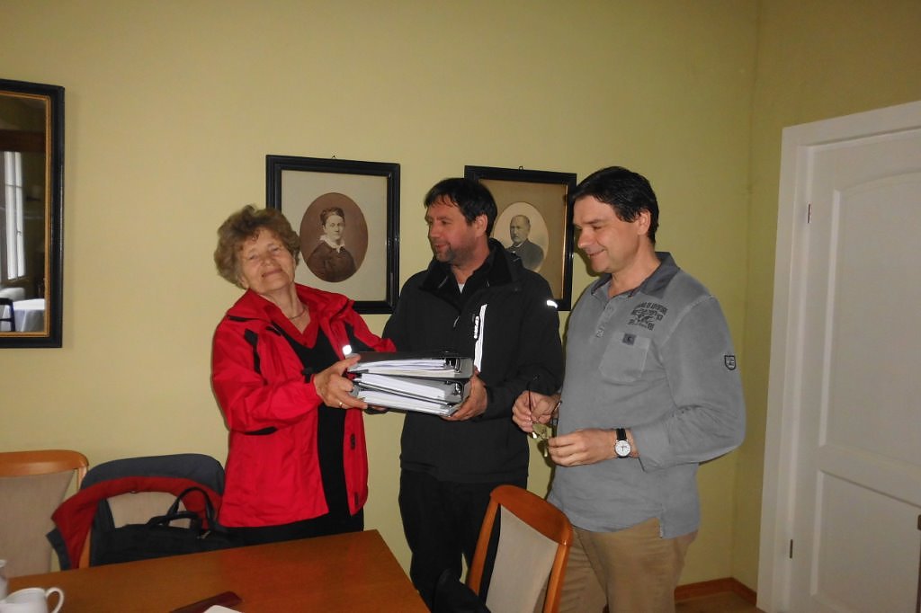 Stefan Petrat, Halle übergibt die umfangreiche Dokumentation nach der umfassenden Sanierung der Haupttreppe, der Straße und der Trockenmauer unter der Verlobungsbrücke an Gisela Hartmann, Vorsitzende der Bürgerstiftung und Sven Liss vom Vorstand des Fördervereins und Vorsitzender des Baustammtisches (Foto: Gisela Hartmann)