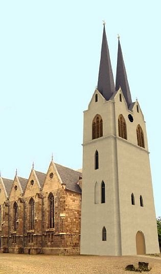 Rund 35 000 Euro hat der Verein für die Arbeiten zur Verfügung gestellt, weitere rund 77 000 Euro flossen über Fördermittel. Mit den Arbeiten wurden die Voraussetzungen geschaffen, um an dieser Stelle den neuen Glockenturm bauen zu können, erläutert der 69-jährige Vereinschef. 54 Meter hoch, drei Geschosse, zwei Türme – so soll der wiederaufgebaute, freistehende Glockenturm der Kirche aussehen. Eine Kopie des markanten Turmes, der die Silhouette der Stadt über 1000 Jahre prägte, ehe er verfiel und dann Mitte der 1960er Jahre abgerissen wurde.