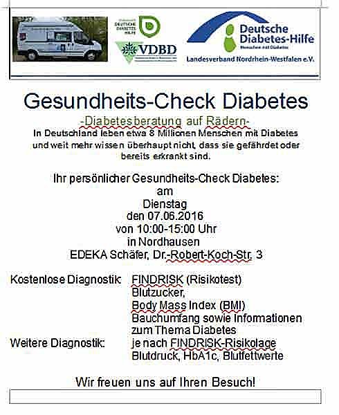 Die Deutsche Diabetes Hilfe- Menschen mit Diabetes führt bundesweit ein ambulantes Früherkennungs-Screening im Rahmen des Projektes Diabetesberatung auf Rädern durch. Wie Sie die kostenlose Beratung in Nordhausen in Anspruch nehmen können und weitere Infos, erfahren Sie hier...