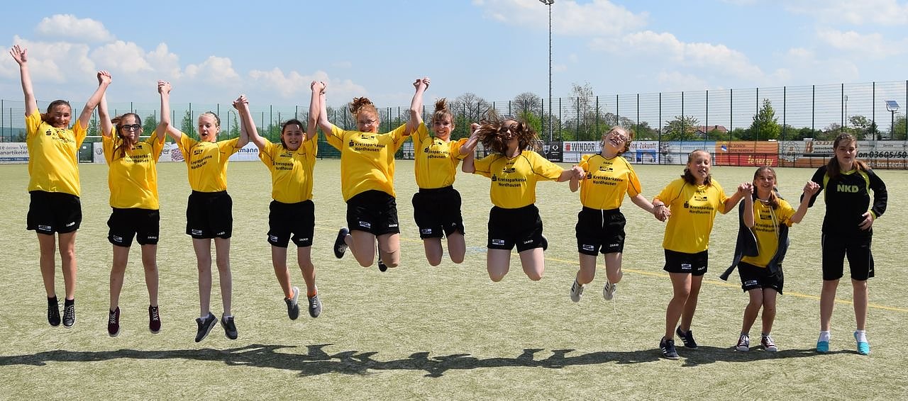Während Mannschaftskapitänin Lisa Gries den Pokal des Schulamtes Nordthüringen in Empfang nahm, freuten sich die Hainleite-Spielerinnen nicht nur über die Wiederholung ihres Vorjahreserfolges, sondern auch über die Qualifikation zum Landesfinale, das am 31.Mai in Jena stattfinden wird.