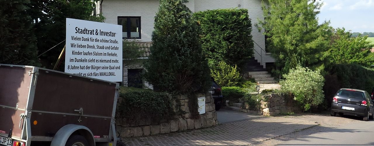 Jörg Prophet war es, der in der Stadtratssitzung im April dieses Jahres auf die Zustände der Straße aufmerksam machte. Ein Plakat mit sarkastischem Text ist dort am Anfang der nicht vorhandenen Straße zu sehen. Der Protest der Anlieger richtet sich sowohl an den Stadtrat, der gemeinsam mit der Verwaltung die Angelegenheit schleifen lässt, als auch an den Investor des Eigenheimstandortes, Axel Heck.