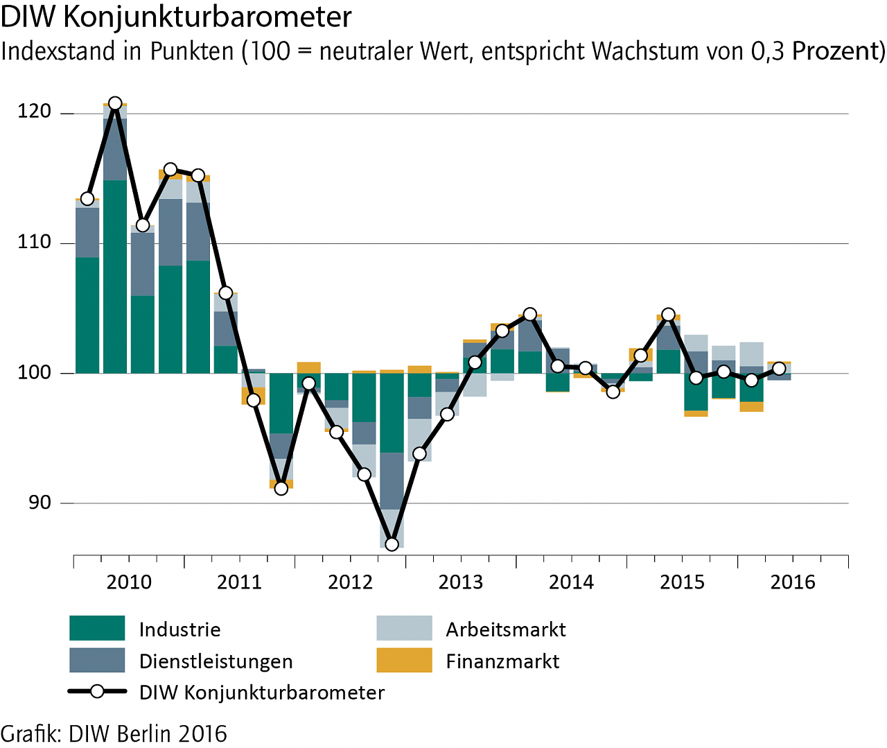 Derzeit kommen deutlich weniger Flüchtlinge nach Deutschland als noch in der zweiten Jahreshälfte 2015. Somit werden durch die Migration nur noch geringe zusätzliche Nachfrageimpulse kommen, sagt Simon Junker, Experte für die Konjunktur in Deutschland. Auch die Nachfrage aus dem Ausland legt zu, allerdings nur leicht: Zwar haben die Exporte zuletzt Fahrt aufgenommen, die Erwartungen der Unternehmen bleiben aber verhalten.