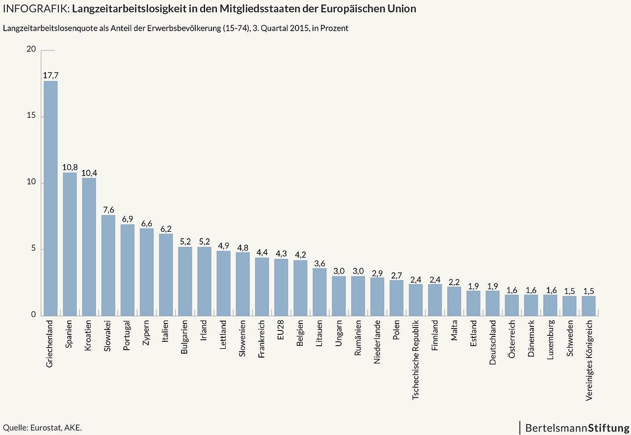2015 waren EU-weit mehr als 10 Millionen Personen länger als 12 Monate erwerbslos. Das entspricht 4,3 Prozent der Erwerbsbevölkerung. Dabei offenbart die Studie ein deutliches Nord-Süd-Gefälle: Am höchsten ist die Langzeitarbeitslosigkeit in Griechenland (17,7 %), Spanien (10,8 %) und Kroatien (10,4 %). Anders als in Deutschland bleibt Langzeitarbeitslosigkeit in diesen Ländern nicht auf sogenannte Risikogruppen wie Geringqualifizierte beschränkt, sondern zieht sich quer durch die gesamte Erwerbsbevölkerung.
