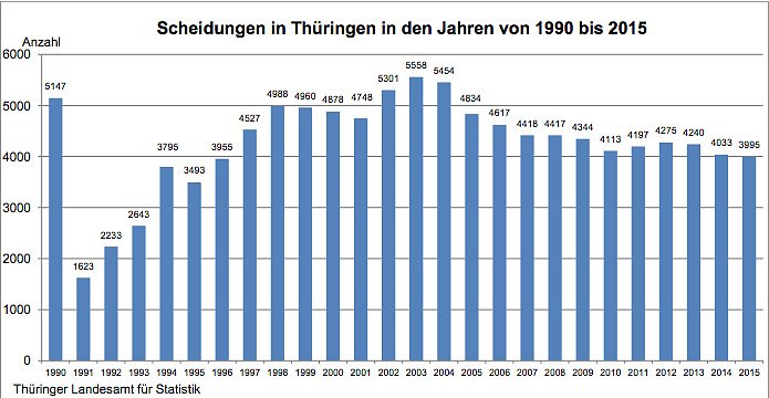 Die Gerichte in Thüringen haben im Jahr 2015 in Thüringen 3.995 Ehen geschieden. Das waren nach Mitteilung des Thüringer Landesamtes für Statistik 38 Scheidungen weniger als im Jahr 2014 und erstmals seit 19 Jahren weniger als 4.000 Ehescheidungen im Jahr...