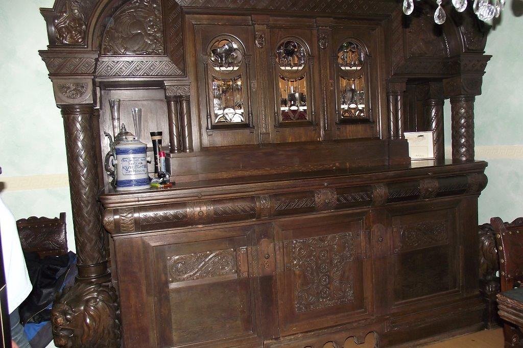 Ein besonders schönes Exemplar ist ein Wohnzimmerbüfett. Hergestellt von der einst heimischen Firma Aurin im Jahre 1905. Die Sockeln zieren links und rechts kunstvoll geschnitzte Löwenköpfe. Die vier Temperamente nennen sich neben den Glasvitrinen in das Holz eingeschnitzte Männerköpfe, die unterschiedlich lächeln. Tische, Stühle und eine Kredenz runden die Zimmereinrichtung ab. Unschätzbare Werte.