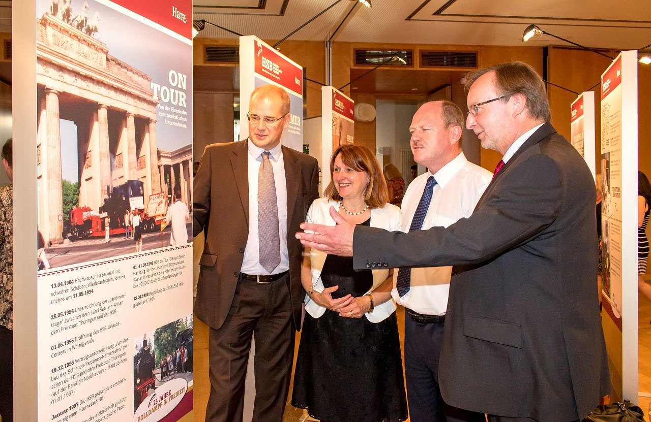 25 Jahre Volldampf in Freiheit in Berlin: HSB-Geschäftsführer Matthias Wagener (rechts) erläutert Sachsen-Anhalts Verkehrsminister Thomas Webel (2. von rechts), der Bundestagsabgeordneten Heike Brehmer sowie Nordhausens Landrat Matthias Jendricke die Ausstellung