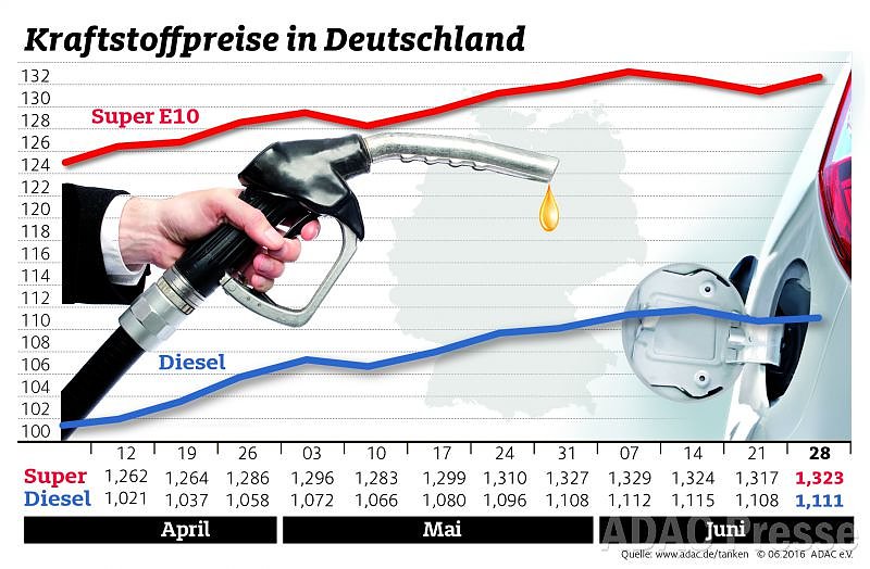 Die Preise für Benzin und Diesel sind in Deutschland im Vergleich zur Vorwoche leicht gestiegen. Wie die aktuelle ADAC-Auswertung der Kraftstoffpreise zeigt, verteuerte sich Super E10 im bundesweiten Schnitt um 0,6 Cent auf 1,323 Euro je Liter. Der Dieselpreis kletterte um 0,3 Cent auf 1,111 Euro...