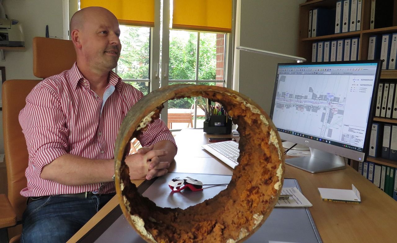Peter Brendel erläutert, was der Laie unter Siedlungswasserwirtschaft verstehen kann: Wir planen und begleiten die Bauarbeiten bei nahezu allen Vorhaben, die unterhalb der Straßendecke realisiert werden. Schwerpunkte dabei sind der Bau von Abwasser- und Trinkwasserleitungen und seit einigen Jahren die Sanierung bestehender Kanäle und Wasserleitungen. Jüngstes Beispiel war die Kanalsanierung und Erneuerung in der Straße der Einheit in Nordhausen.