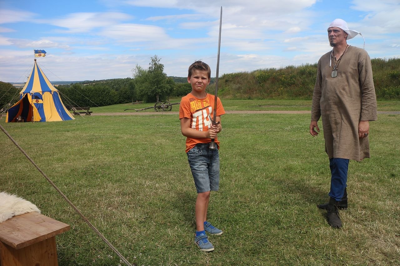 Auch hier trifft man historische Persönlichkeiten: Adelheid von Burgund etwa. "Auch Theophanu wäre gerne mit dabei gewesen, aber die muss leider arbeiten", sagt Mario Falk, der auch neugierigen Besuchern gerne dabei hilft, Kettenhemd und Brillenhelm anzulegen. Dabei gehe es den "Raben" eigentlich nicht vordergründig um das martialische, erklärt Falk, sondern mehr darum, wie die Menschen damals gelebt haben, wie sie gebaut, gebacken und gekocht haben. Dazu kommen Exkursionen in die Region, Fährtensuchen auf der Streuobstwiese, Saftpressen, Höhlenerkundung in der Heimkehle und Reitausflüge.