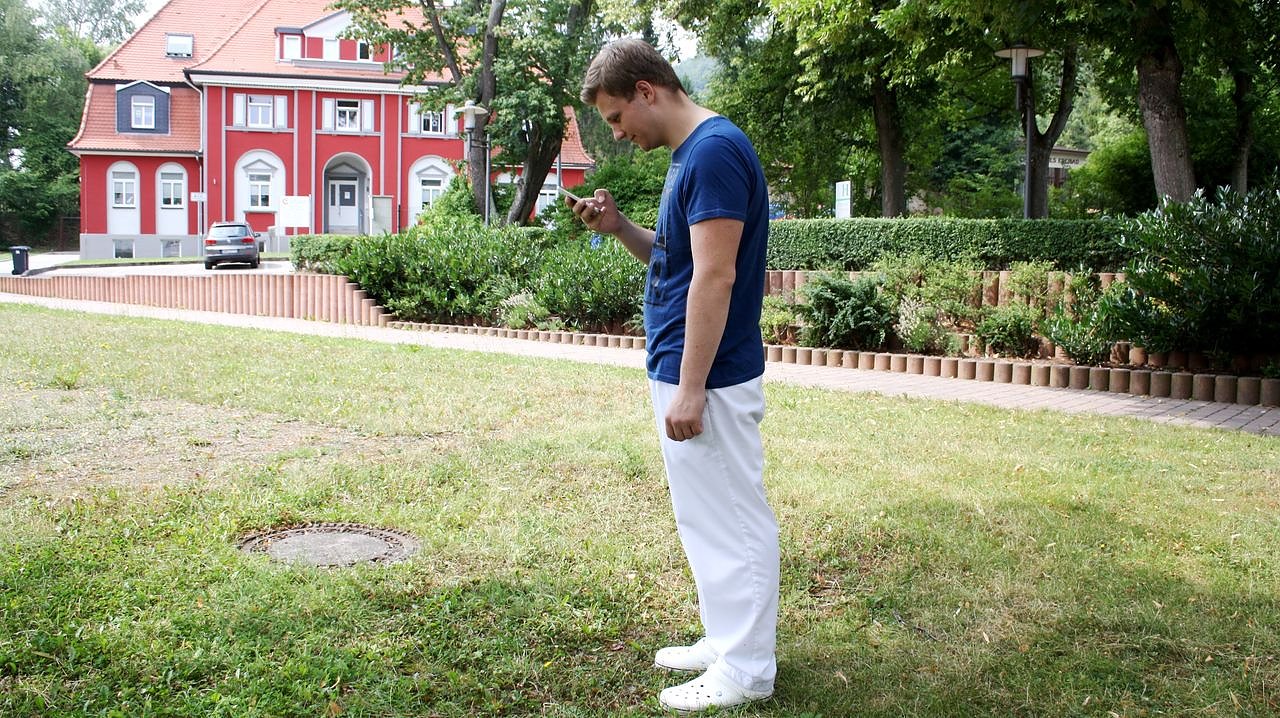 André Johne, Praktikant in der Physiotherapie der HELIOS Klinik Bleicherode, simuliert die ungesunde Handyhaltung beim Blick auf sein Smartphone. (Foto: J. Weller)